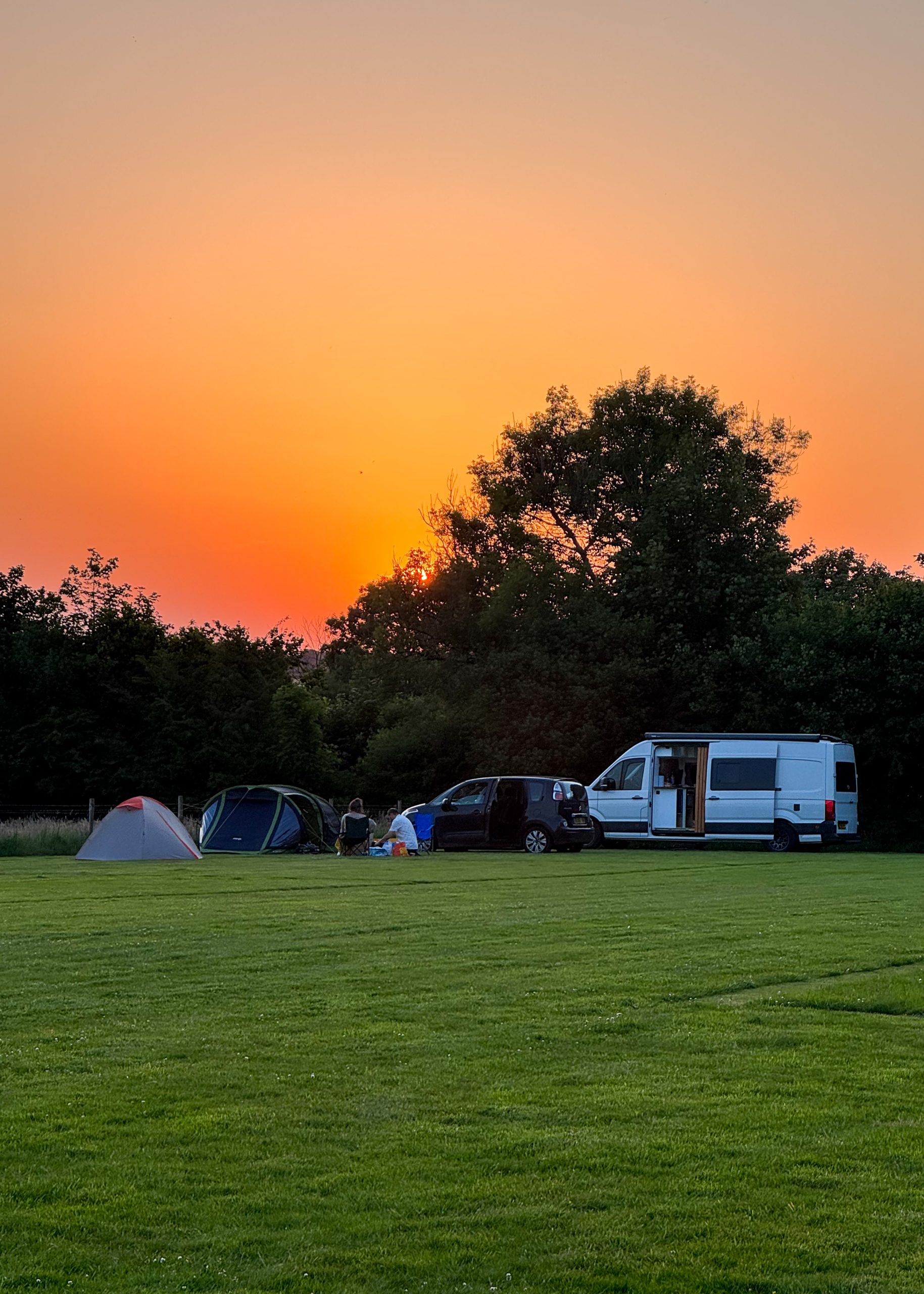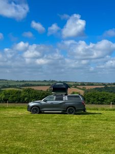 A large, level grass pitch suitable for tents, campers, or roof tents